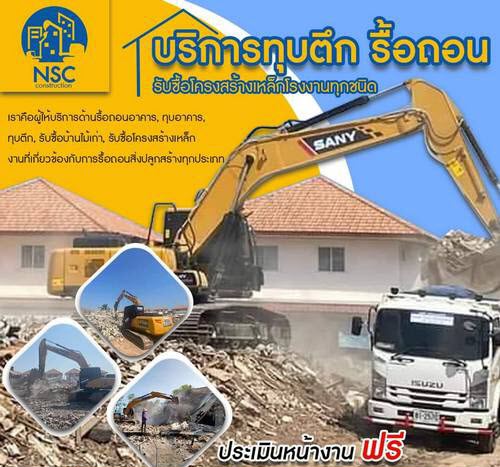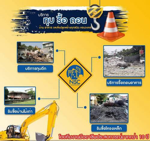 บริษัท เอ็นเอสซี คอนสตรัคชั่น จำกัด ผู้ให้บริการด้านทุบตึก รื้อถอน บ้าน อาคาร ตึกเก่า หรือสิ่งปลูกสร้างทุกชนิด ,รับซื้อโครงสร้างเหล็ก ทุกประเภท ให้ราคาสูง บริษัทของเรามีความพร้อมทางด้านเทคนิค บุคลากร วิศวกร เครื่องจักร มีความเชี่ยวชาญเฉพาะด้าน และได้รับความไว้วางใจจากลูกค้ามากมาย พร้อมทั้งประสบการณ์ และความชำนาญในงานอย่างแท้จริง
